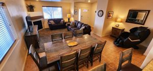 Living Room: Large Smart TV with Netflix surrounded by couches adjacent to dining area, reading nook, office workspace, and kitchen with backyard access to outdoor seating, gas grill, and fully fenced yard. Couch has pullout mattress and can sleep 2 in the living room.