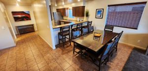 Kitchen: Equipped for group meals and includes: Coffee Maker, Bean Grinder, Toaster, Ice Maker, Blender, Microwave, Dishwasher, Stove, Oven, Refrigerator, Plates, Cups, Glasses, Silverware, and Utensils. Kitchen has high top counter with bar stools.