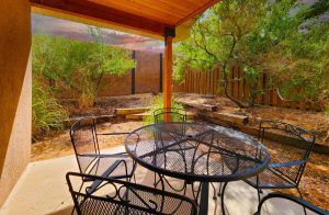 (1) King Master Suite has private attached bathroom with backyard access to the attached covered porch, outdoor seating, and shade trees.